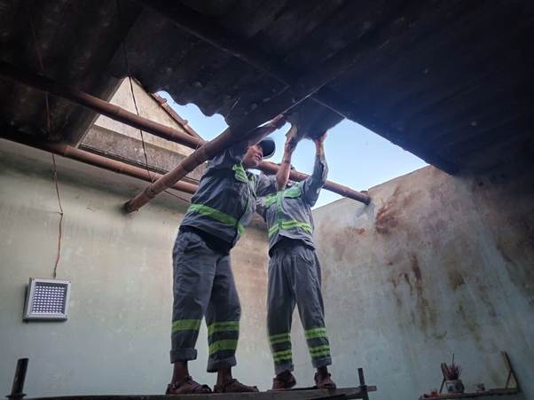 Công nhân CN Công ty Môi trường Đô thị phía Bắc Quảng Ngãi sửa chữa căn nhà chị Hồ Thị Phi