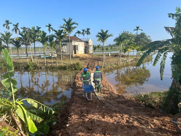 Công nhân CN Công ty Môi trường Đô thị phía Nam Quảng Ngãi dọn dẹp, làm đường vào căn nhà chị Cao Thị Út Nữ